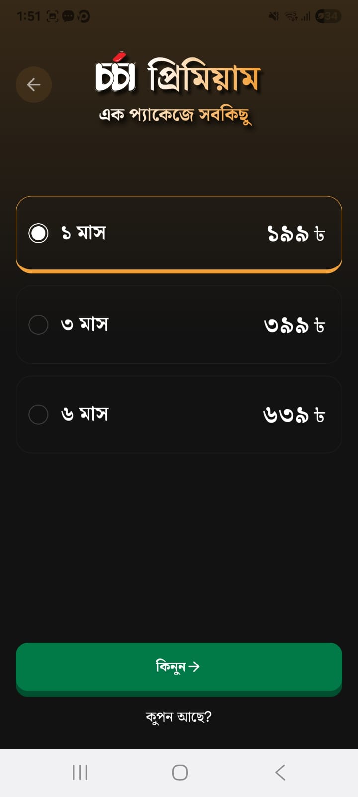 চর্চায় সাবস্ক্রিপশন নেয়ার সময় কুপন অপশনে গিয়ে CHORCHA লিখলেই পাবেন ২০% ডিসকাউন্ট |