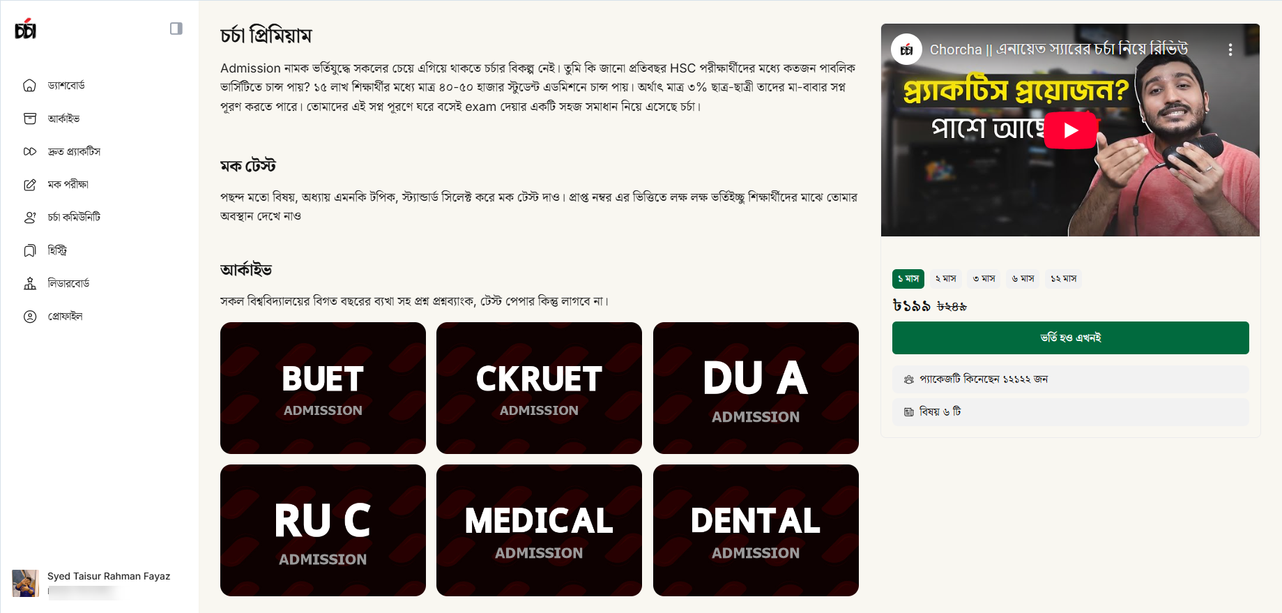 চর্চায় বেশ কিছু ফ্রি অপশন আছে। যেমন ধরো আনলিমিটেড দ্রুত প্র্যাক্টিস, আনলিমিটেড ফ্রি ডাউট সলভ, প্রশ্নব্যাংক ইত্যাদি। তবে পুরোপুরি সব সুবিধা নিতে গেলে তোমাকে প্রিমিয়াম নিতে হবে। যা নিতান্তই সস্তা। ২ ডজন ডিমের দামের থেকেও কম দাম দিয়ে ১ মাসের সাবস্ক্রিপশন নিতে পারবে