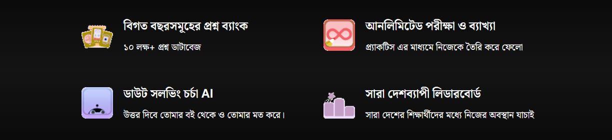 ৪. এছাড়াও ডেইলি ও উইকলি লিডারবোর্ড এবং Medical, BUET, CKRUET, DU, GST ও অন্যান্য সকল ভার্সিটির স্পেশাল মডেল টেস্ট