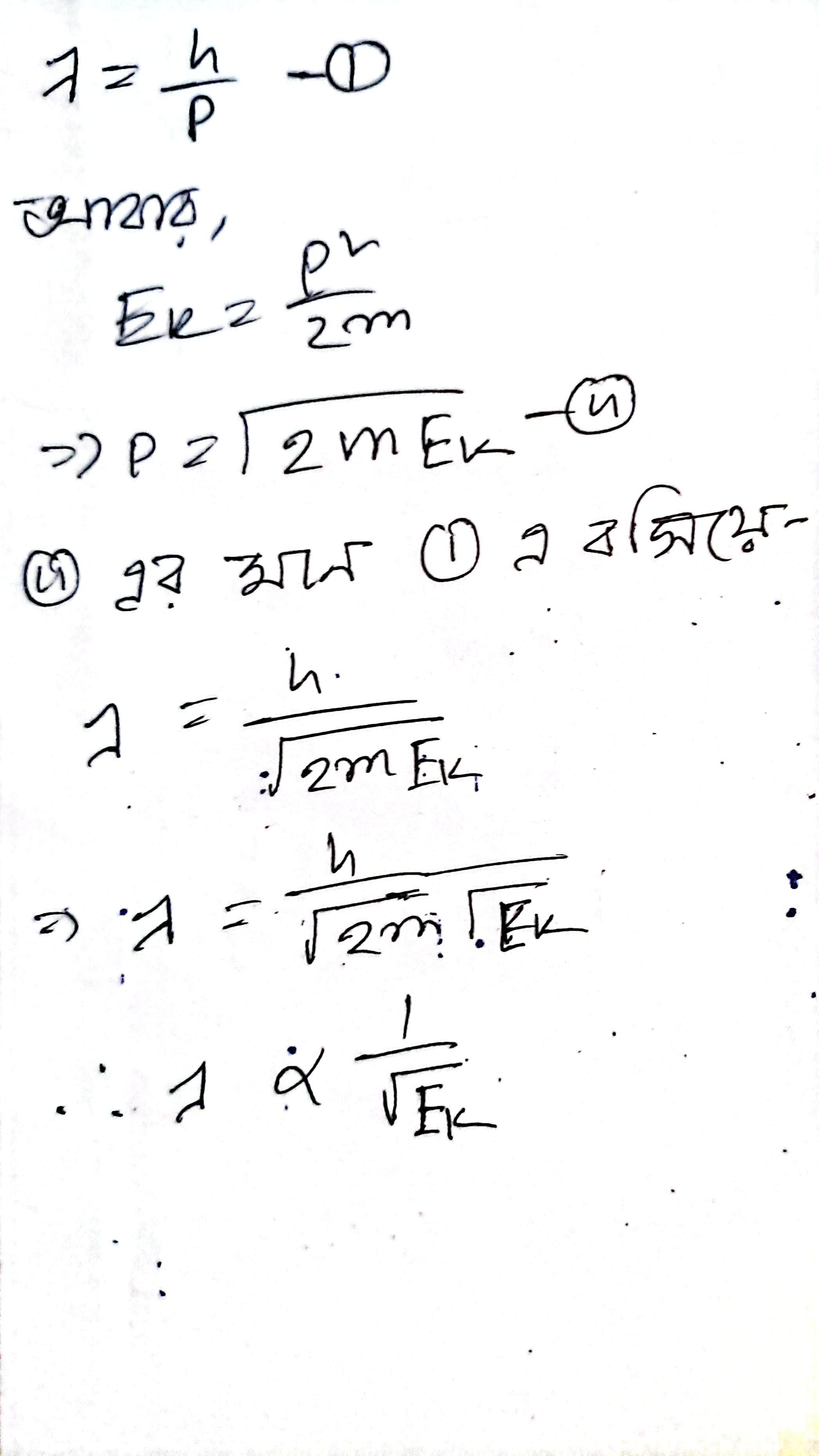 একটি ইলেকট্রনের গতিশক্তি E হলে এর সঙ্গে জড়িত ডি ব্রগলি তরঙ্গদৈর্ঘ্য (λ) E-এর ওপর নির্ভর করে—