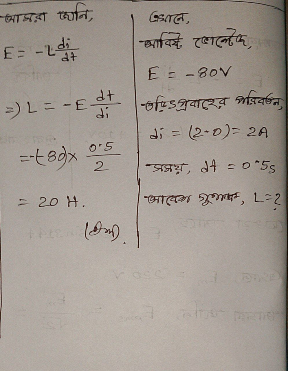 একটি কুণ্ডলীতে প্রবাহমাত্রা 0.5 sec সময়ে 0A থেকে 2A হলে ওই কুণ্ডলীতে 80V তড়িচ্চালক বল আবিষ্ট হয়। কুণ্ডলীর আবেশ গুণাঙ্ক কত?