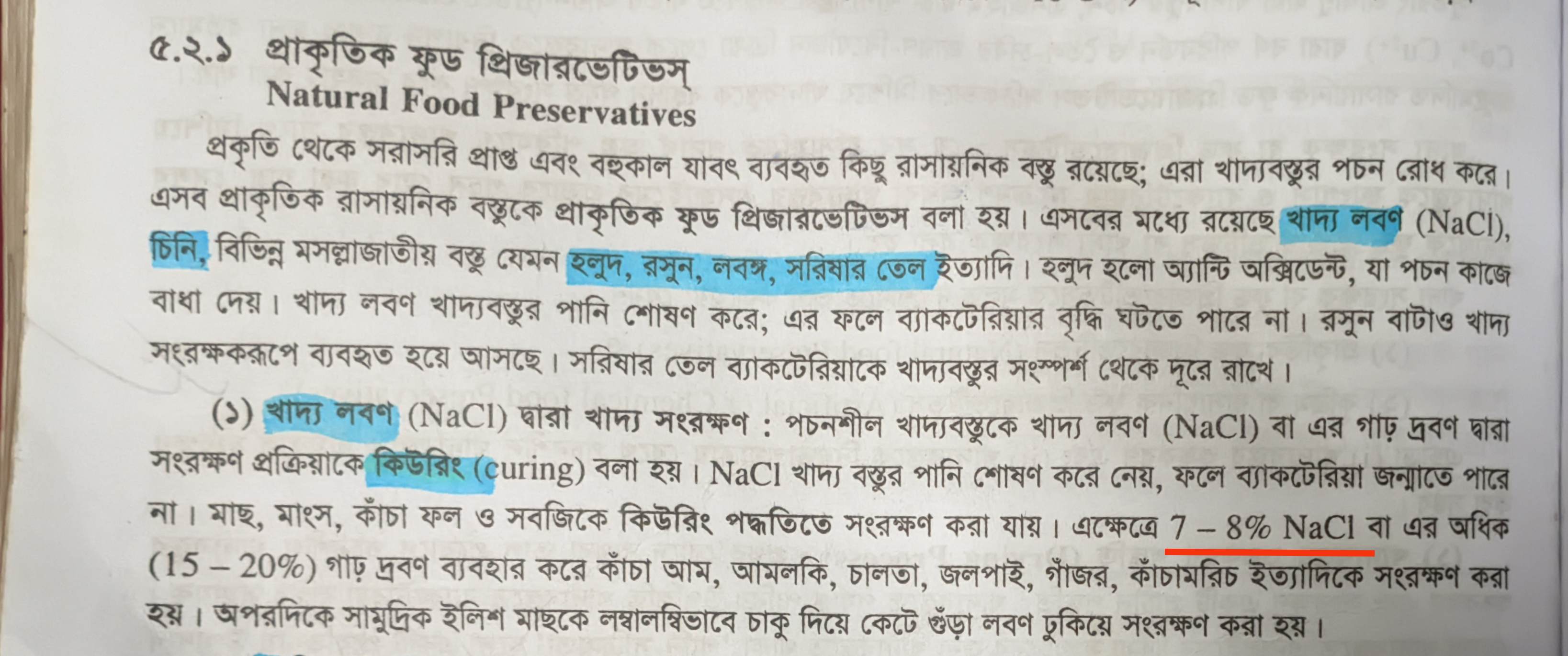 কিউরিং পদ্ধতিতে খাদ্য সংরক্ষণে কি পরিমাণ NaCl ব্যবহার করা হয়?
