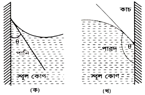 আর স্পর্শ কোণ 90° অপেক্ষা বড় হলে স্থূল স্পর্শ কোণ হয়। যে সব তরলের ঘনত্ব কঠিনের ঘনত্ব অপেক্ষা বেশি, সেসব তরল সাধারণত কঠিনকে ভিজায় না। এক্ষেত্রে স্পর্শ কোণ স্থূলকোণ হবে। যেমন পারদ। ।