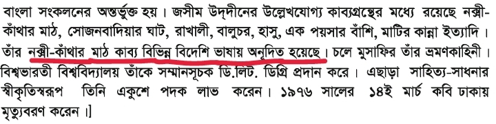 •‘নকশী কাঁথার মাঠ' বাংলা সাহিত্যের একটি অনবদ্য আখ্যানকাব্য। ১৯২৯ সালে কাব্যটি প্রকাশের পরই এম মিলফোর্ড 'The Field of Embroidered Quilt' নামে ইংরেজিতে অনুবাদ করেন।