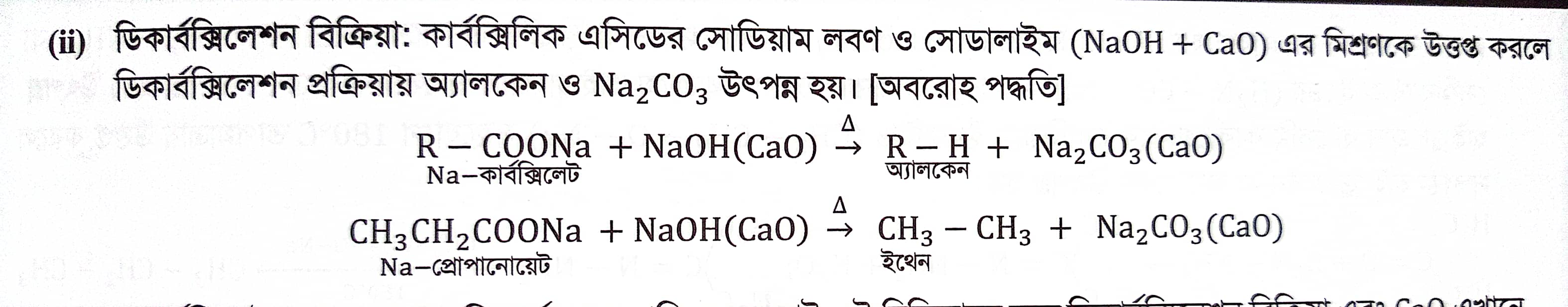 ডিকার্বোক্সিলেশন বিক্রিয়ায় অ্যালকেন উৎপন্ন হয়। CNG তে CH4 এর পরিমাণ 96%।