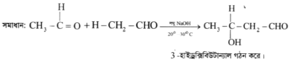 d) লঘু সোডিয়াম হাইড্রোক্সাইড এর উপস্থিতিতে দুই অণু অ্যাসিটালডিহাইড পরস্পরের সাথে বিক্রিয়া করলে।