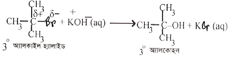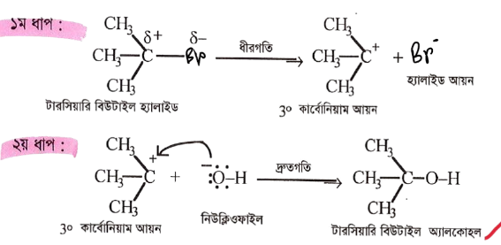 বিক্রিয়ার কৌশল : ১ম ধাপে 3°-অ্যালকাইল হ্যালাইড ধীর গতিতে বিয়োজিত হয়ে অধিক স্থায়ী 3° কার্বোনিয়াম আয়ন ও হ্যালাইড আয়ন সৃষ্টি করে। এক্ষেত্রে RX এর বিয়োজনে পোলার দ্রাবক পানি অণুর সাথে HO আয়নের পানি-যোজন কালে নির্গত তাপ শক্তি মূল ভূমিকা থাকে। ২য় ধাপে নিউক্লিওফাইল HO আয়ন ঐ কার্বোনিয়াম আয়নে দ্রুত গতিতে যুক্ত হয়।