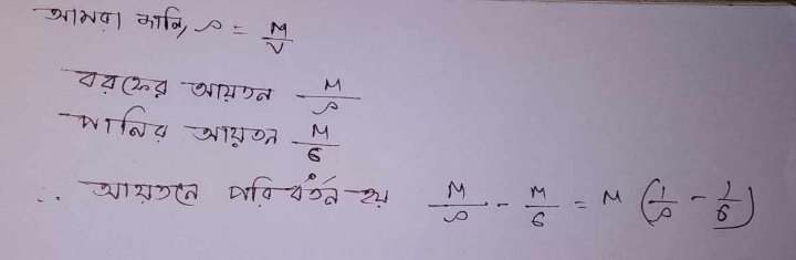 বরফের ঘনত্ব এবং পানির ঘনত্ব । M ভরের বরফ গলে গেলে আয়তন হ্রাসের পরিমাণ কত?