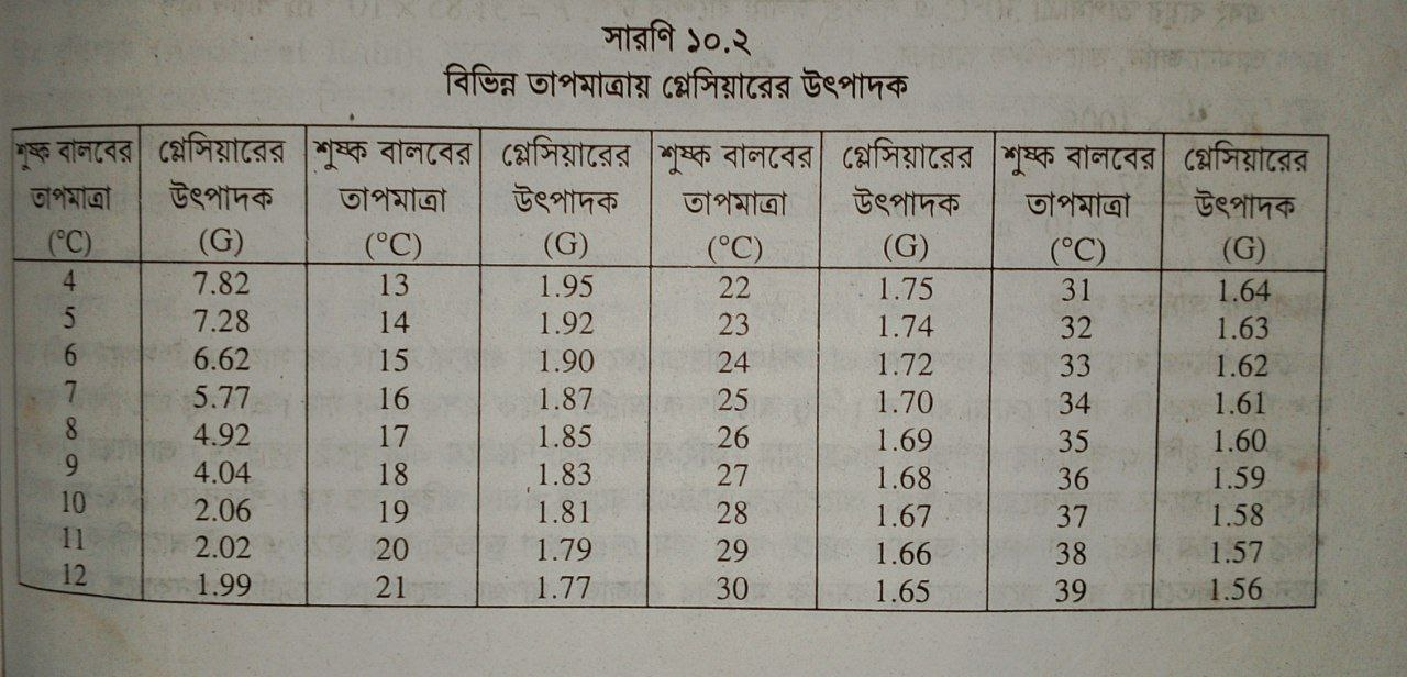 ভিন্ন ভিন্ন তাপমাত্রায় সম্পৃক্ত জলীয়বাষ্পচাপ ও গ্লেইসারের উৎপাদকের মান নিচের সারণি ১-এ প্রদত্ত হলো :