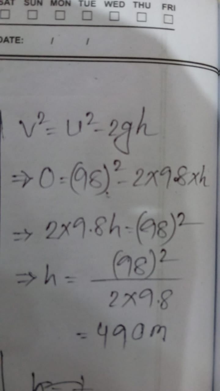 1 টি বস্তুকে 98ms-1 বেগে খাড়া উপরের দিকে নিক্ষেপ করলে তা সর্বোচ্চ কত উচ্চতায় উঠবে?