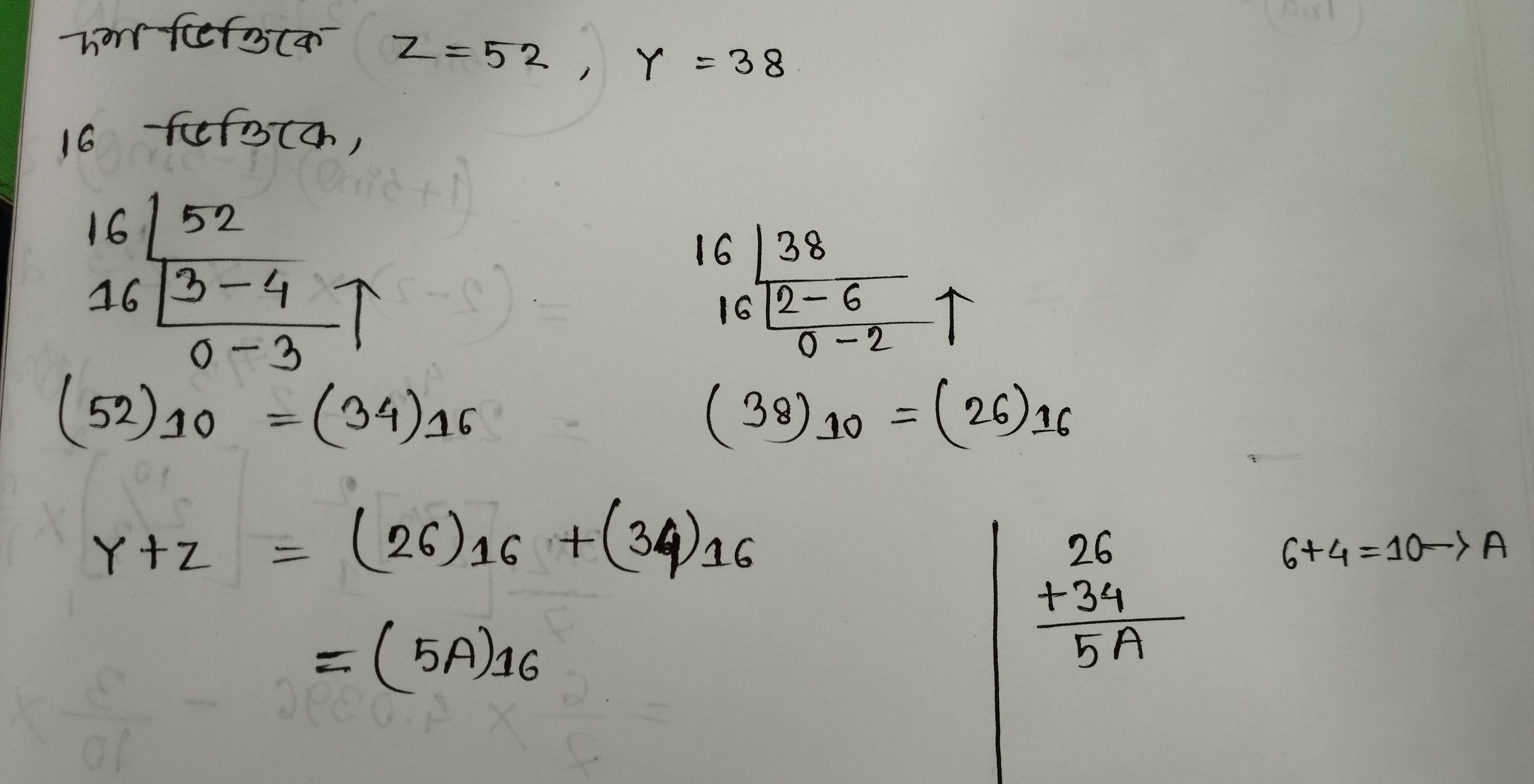 10 ভিত্তিক সংখ্যা পদ্ধতিতে Z=52,এবং Y=38 হলে , 16 ভিত্তিক সংখ্যা পদ্ধতিতে Z+Y=কত?