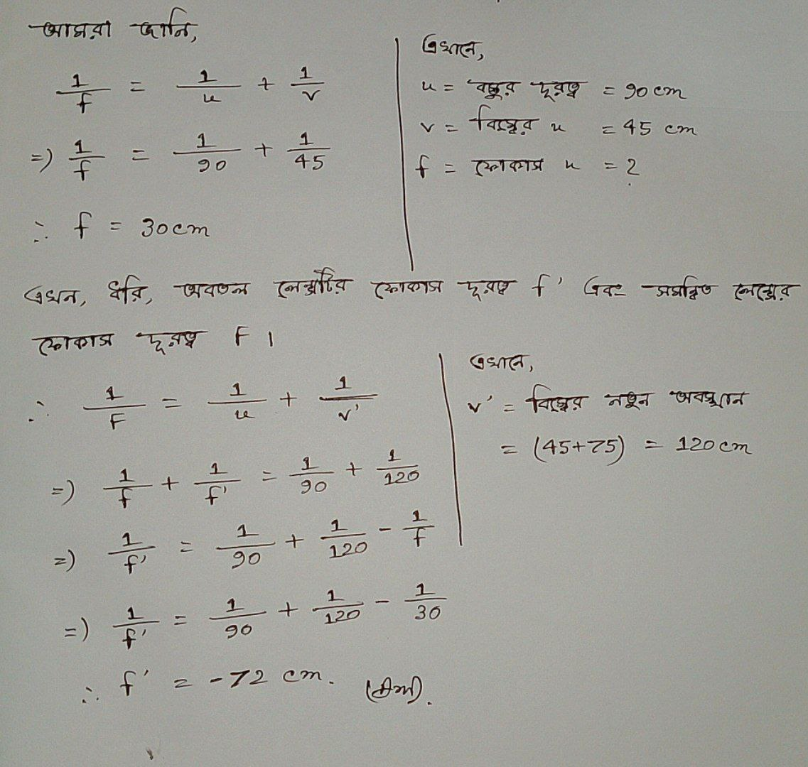 একটি উত্তল লেন্স থেকে 90cm দূরে একটি বস্তুকে রাখা হলে 45cm দূরের পর্দায় একটি বাস্তব প্রতিচ্ছবি তৈরি করে। এই লেন্সের গা ঘেঁষে একটি অবতল লেন্স লাগানাে হলে আরও 75cm দূরে একটি বাস্তব প্রতিচ্ছবি সৃষ্টি হয়। অবতল লেন্সের ফোকাস দূরত্ব নির্ণয় কর।