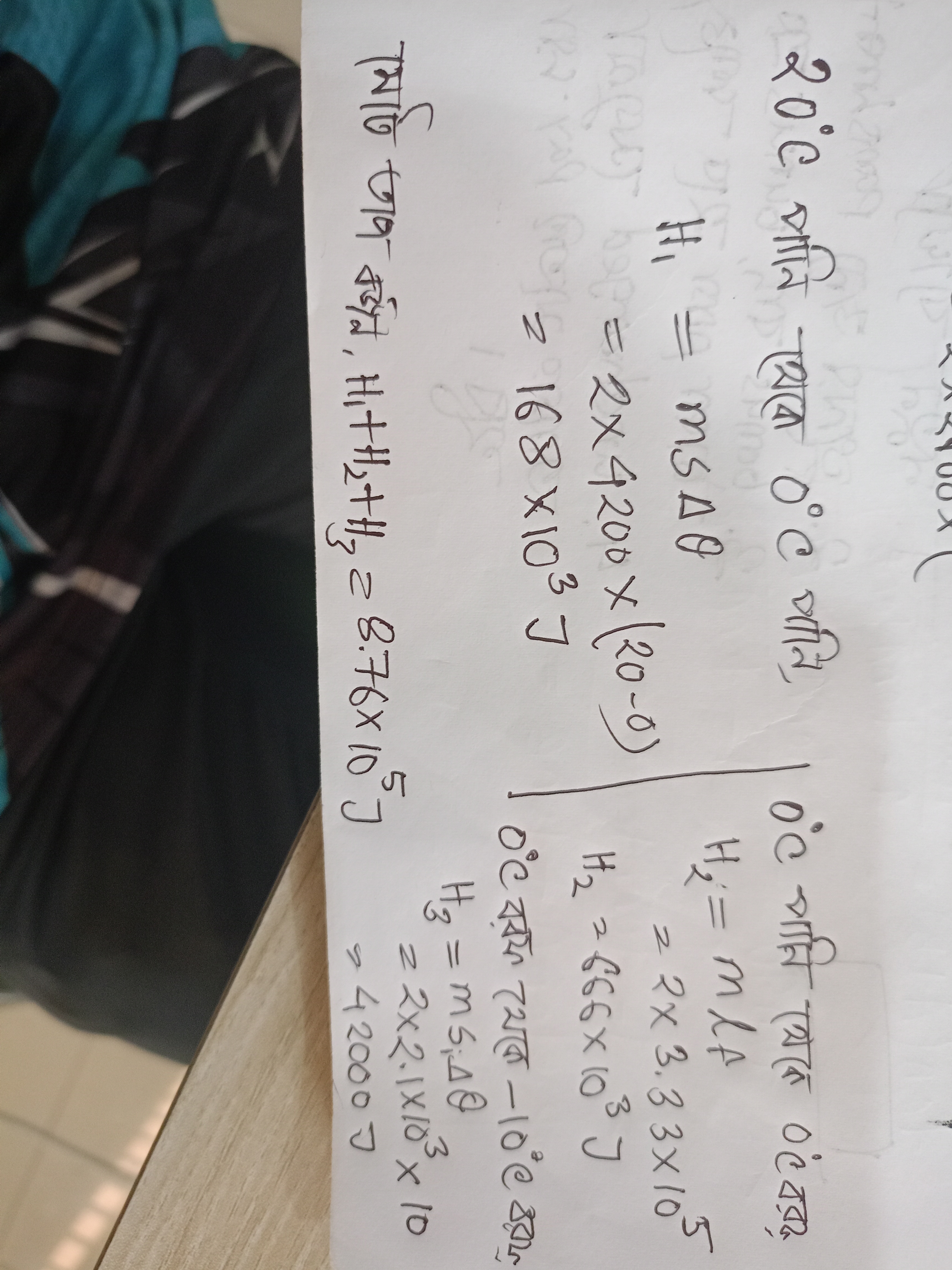 20°C তাপমাত্রার ২কেজি পানিকে -10°C তাপমাত্রার বরফে পরিণত করতে একটি রেফ্রিজারেটরকে কি পরিমাণ তাপ বর্জন করতে হবে? পানির আপেক্ষিক তাপ=4.2×103 J/kg-k, বরফের আপেক্ষিক তাপ=2.1×103 J/kg-k, বরফ গলনের আপেক্ষিক সুপ্ততাপ=3.33×105 J/kg