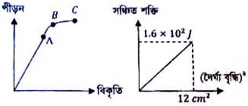 50 cm দীর্ঘ এবং 20mm2 প্রস্থচ্ছেদের দুটি ভিন্ন তার নেয়া হল। ১ম চিত্রে প্রথম তারের পীড়ন বনাম বিকৃতি লেখচিত্র দেখানো হল। A বিন্দুটি প্রথম তারের স্থিতিস্থাপক সীমা নির্দেশ করে। C বিন্দুতে তারটির উপাদানের অসহ পীড়ন 5.5 × 107Nm-2। ২য় চিত্রে দ্বিতীয় তারের সঞ্চিত শক্তি বনাম (দৈর্ঘ্য বৃদ্ধি)2 লেখচিত্র দেখানো হল। A বিন্দুর স্থানাংক (5.8 × 10-3, 2.5 × 10Nm-2)।