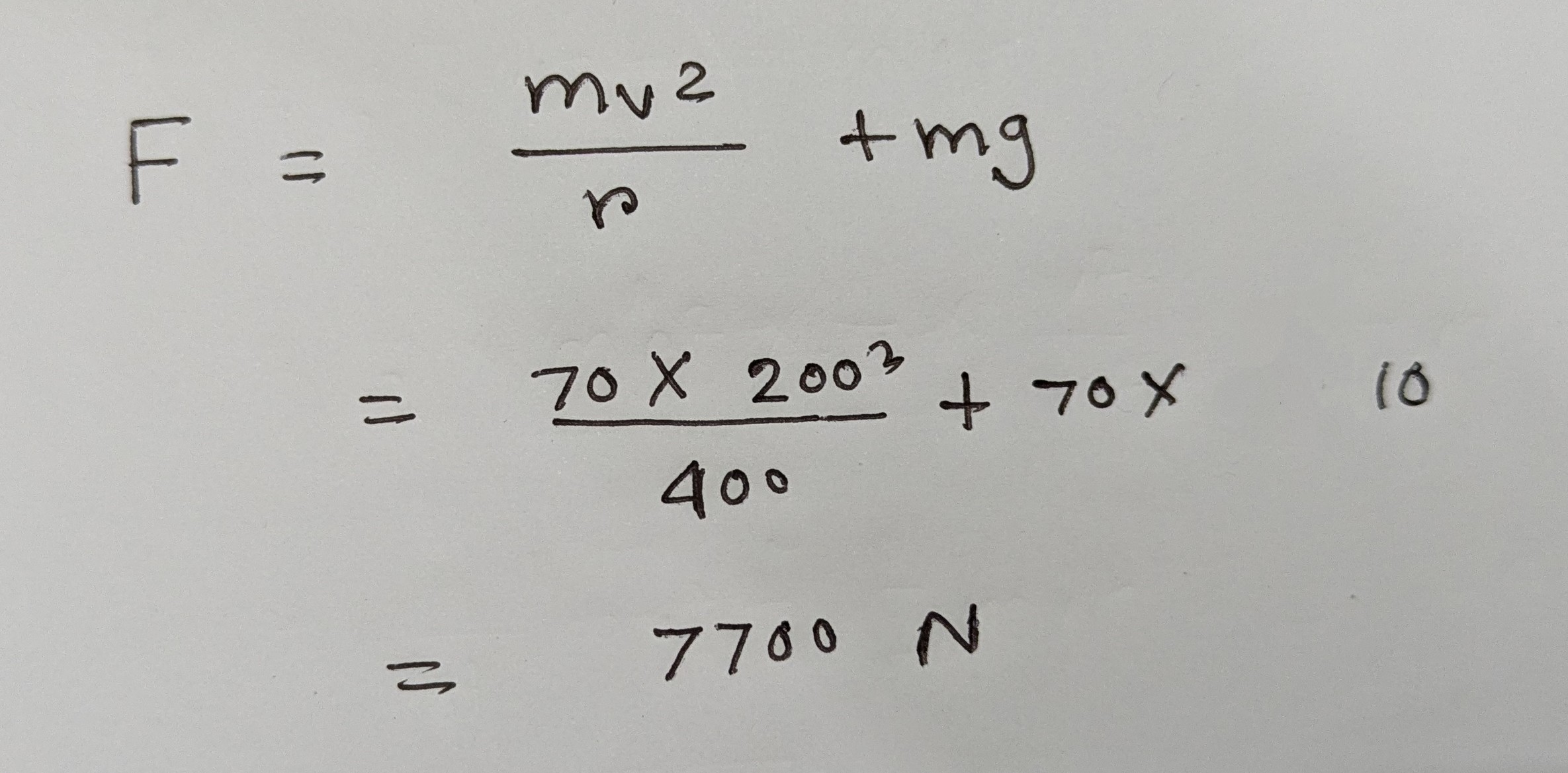 An aeroplane flying in the sky with a uniform speed of 200 m/s moves in a vertical circle of radius 400 m. The mass of the pilot is 70 kg. The force exerted by the pilot on the seat at the lowest point on the circle will be(g=10 m/s^2)