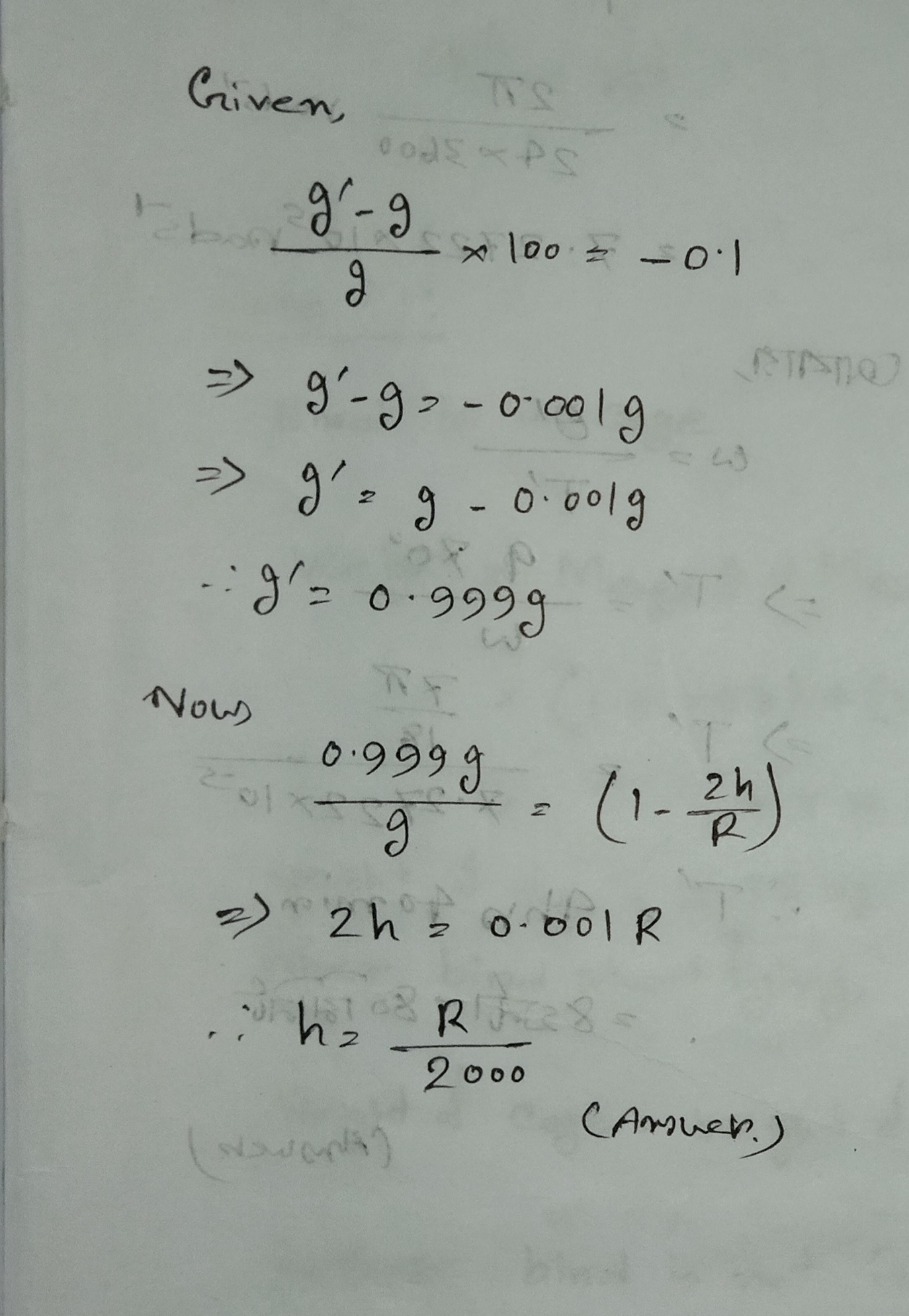 At which height above the surface of the earth of radius , will the acceleration due to gravity decrease by ?