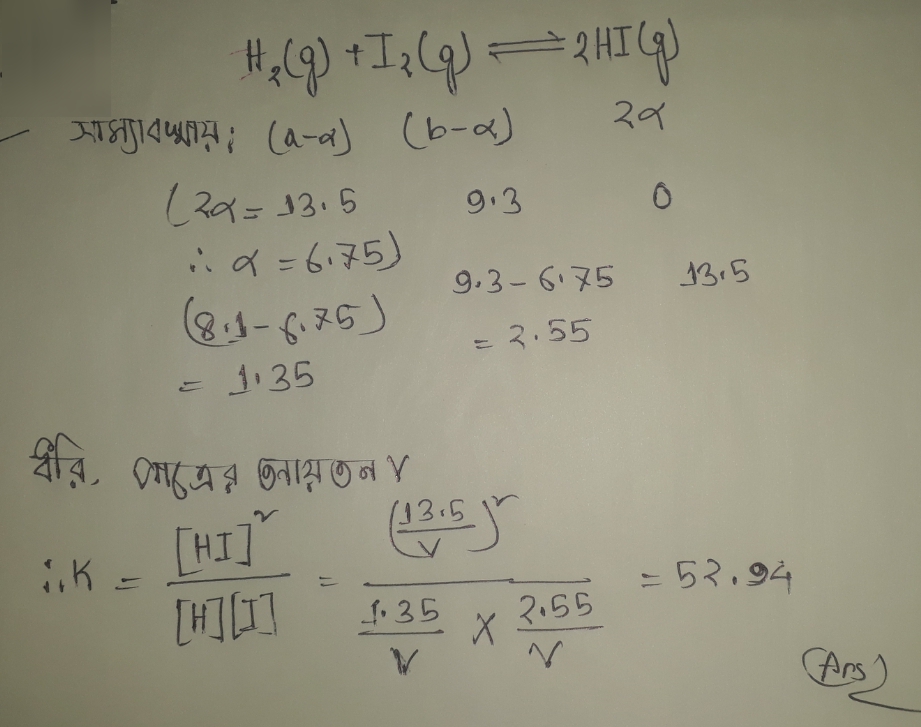 444°C তাপমাত্রায় 8.1 মি.লি হাইড্রোজেন 9.3 মি.লি আয়োডিনের সহিত বিক্রিয়ায় 13.5 মি.লি হাইড্রোজেন আয়োডাইট (HI) তৈরি করে। একই তাপমাত্রায় বিক্রিয়াটির সাম্য ধ্রুবক নির্ণয় কর।