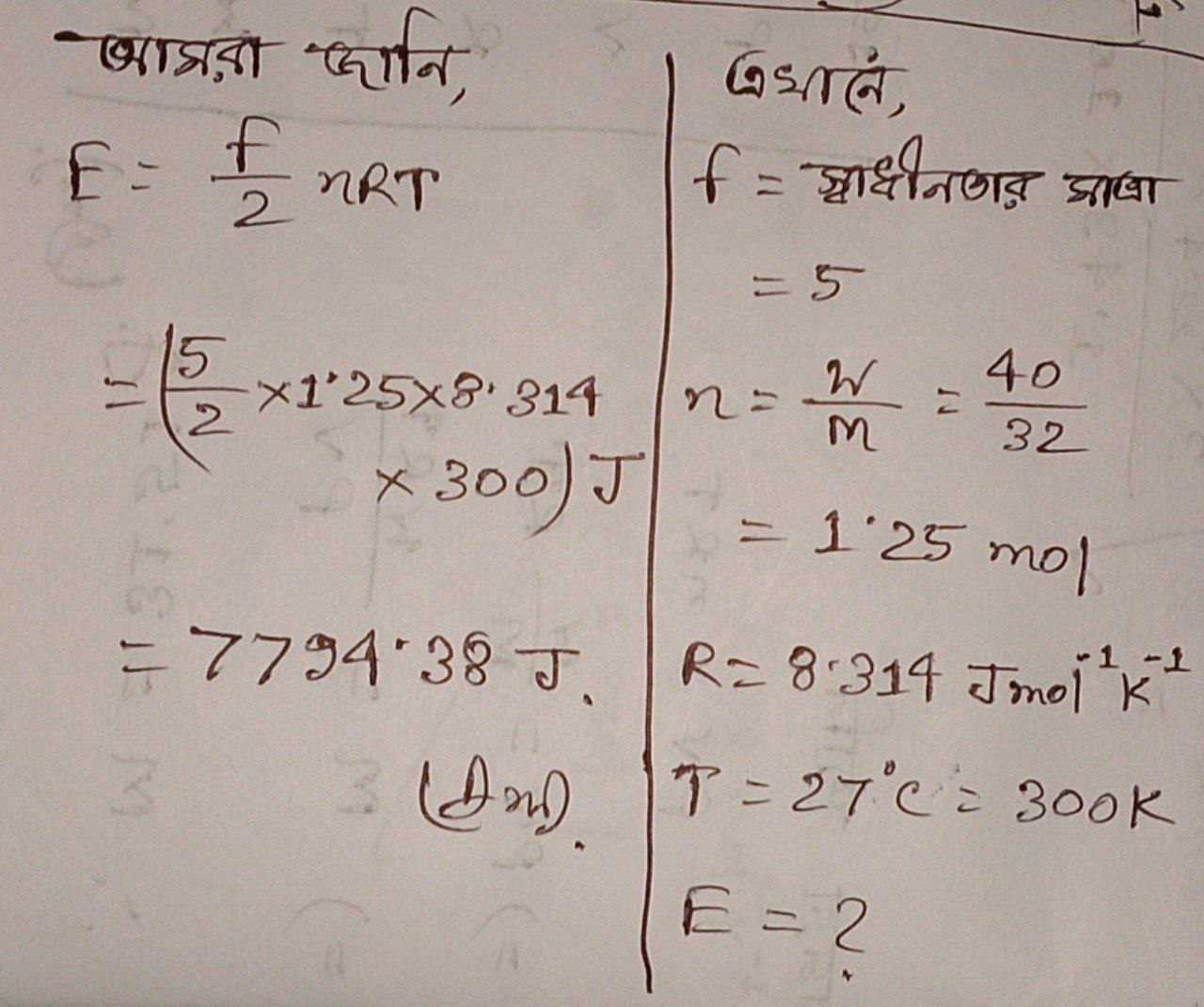 \(R=8.31\ JK^{-1}mole^{-1},O_2\) এর আণবিক ভর = 32 gm চিত্রানুযায়ী A পাত্রের গ্যাসের মোট গতিশক্তি— - চর্চা