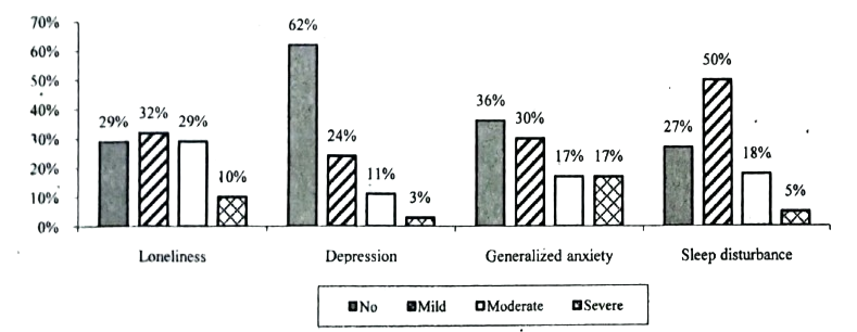 The graph shows the impact of COVID-19 on mental health. The graph portrays a comparative study of four major psychological problems that people faced due to the COVID-19 pandemic. From the graph, it is quite clear that people are mostly suffering from sleep disturbance, which is . Though it is mild, highest number of people suffer from it whereas people have no sleep disturbance and have moderate and have severe sleep disturbance. Again, while people suffer from mild loneliness, feel moderately lonely and face severe loneliness. And people doesn't feel lonely at all. Though people have no depression, people have mild depression. About people are moderately depressed whereas people are severely depressed. In respect of generalized anxiety, people suffer from it moderately, and suffer from it severely. While people have no anxiety disorder, people have mild anxiety disorder. However, from the analysis of the graph, it can be concluded that the COVID-19 pandemic has greatly affected us psychologically, and we should take immediate steps to improve our mental health.