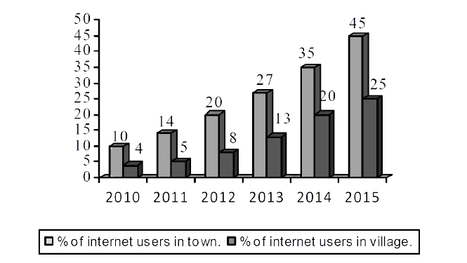 1. The graph below shows "The number of internet users in town and village from 2010 to 2015". Describe the graph