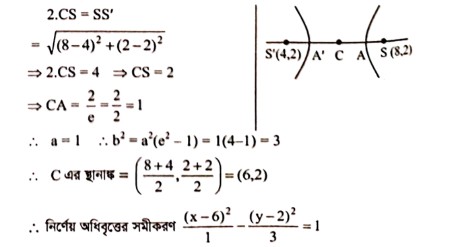 অধিবৃত্তের সমীকরণ নির্ণয় কর যার ফোকাসদ্বয় (4, 2) ও (৪, 2) এবং উৎকেন্দ্রিকতা 2 হলে অধিবৃত্তের সমীকরণ নির্ণয় কর।