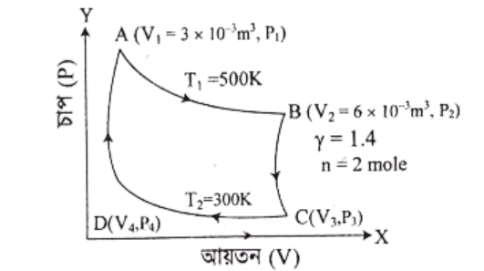 চিত্রে, একটি সিলিন্ডারের মধ্যে রাখা 10 mole গ্যাসের মধ্য দিয়ে বিভিন্ন তাপগতীয় প্রক্রিয়ায় পরিবর্তন দেখানো হচ্ছে।