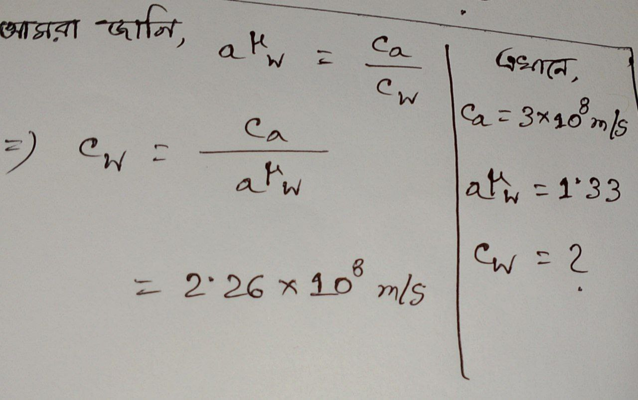 একটি আলো রশ্মি শূন্য মাধ্যম হতে পানি মাধ্যমে প্রবেশ করলো। দেয়া আছে, শূন্য মাধ্যমে আলোর দ্রুতি s ও পানির প্রতিসরাঙ্ক ।