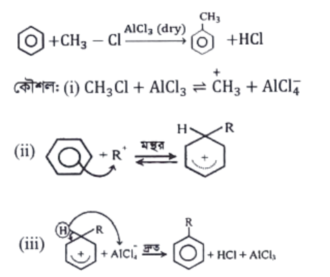 বেনজিনের অ্যালকাইলেশনে ব্যবহৃত বিক্রিয়াটির নাম কী? বিক্রিয়াটি লিখ ও বিক্রিয়ার কৌশল দেখাও।