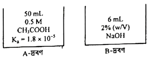 উদ্দীপকের I নং পাত্রের অম্ল 4.5 g 4.5 \mathrm{~g} 4.5 g এবং সোডিয়াম ইথানয়েট 7.5 g 7.5 \mathrm{~g} 7.5 g পানিতে দ্রবীভূত করে 500NO2 500 \mathrm{NO}_{2} 500NO2 দ্রবণ প্রস্তুত করলে দ্রবণের pH \mathrm{pH} pH নির্ণয় করো। [Ka=1.8×10−5] \left[\mathrm{K}_{\mathrm{a}}=1.8 \times 10^{-5}\right] [Ka=1.8×10−5]