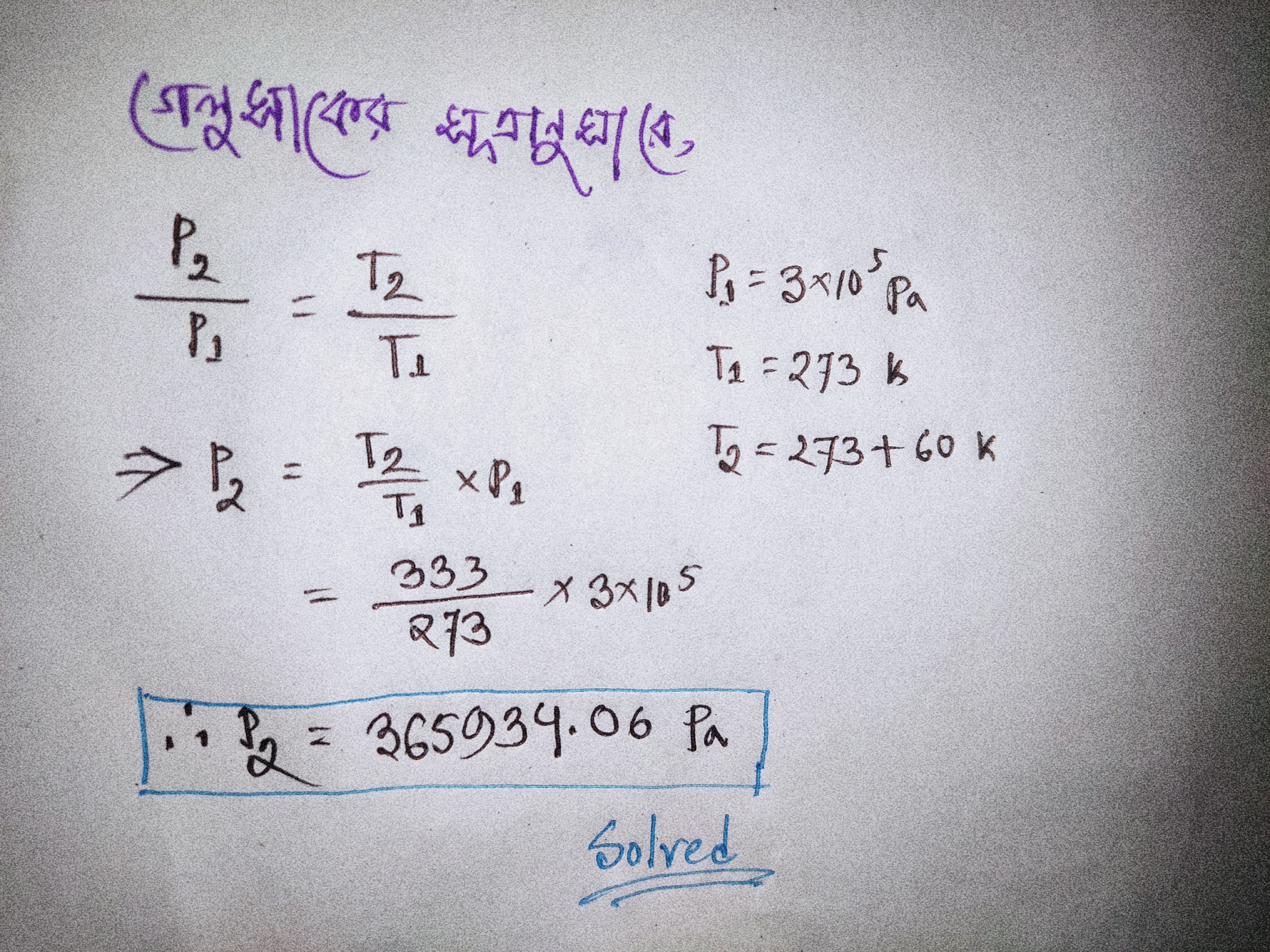 0°C তাপমাত্রায় কোনো গ্যাসের চাপ 3×105 Pa ,হলে 60°C তাপমাত্রায় এর চাপ কত হবে?