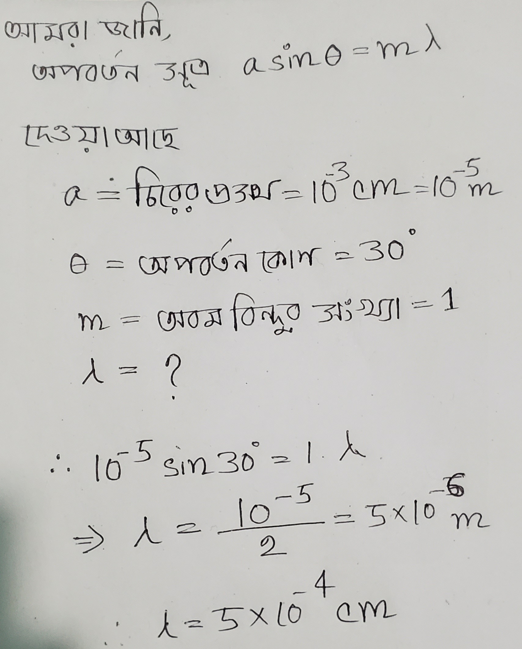 প্রস্থের একটি চিরের ভেতর দিয়ে একটি তাড়িত চৌম্বকীয় তরঙ্গ প্রথম অবম বিন্দুর জন্য অপবর্তন কোণ সৃষ্টি করে। তরঙ্গটির তরঙ্গদৈর্ঘ্য কত?