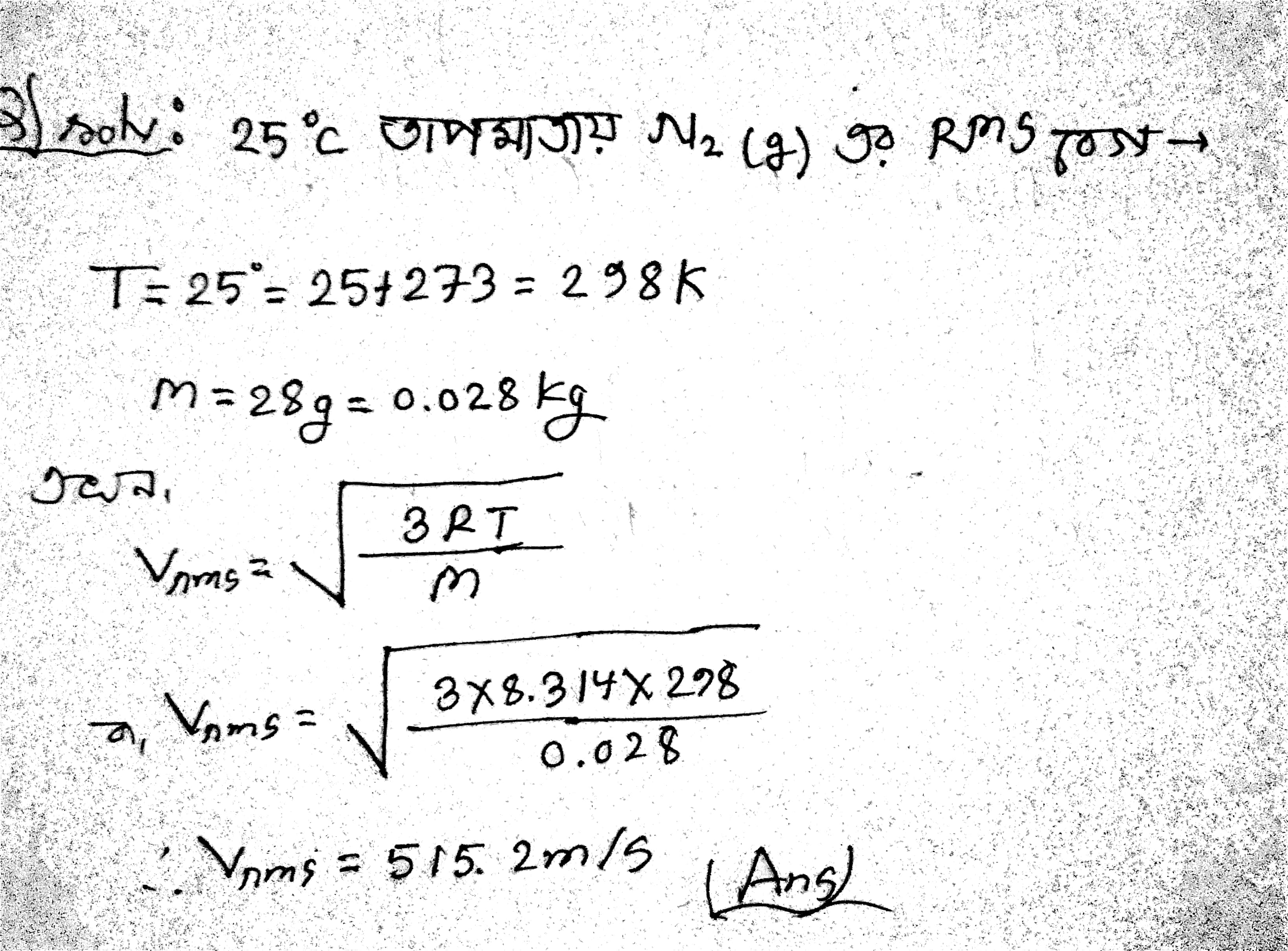 25°C তাপমাত্রায় N₂ গ্যাসের RMS বেগ কত?