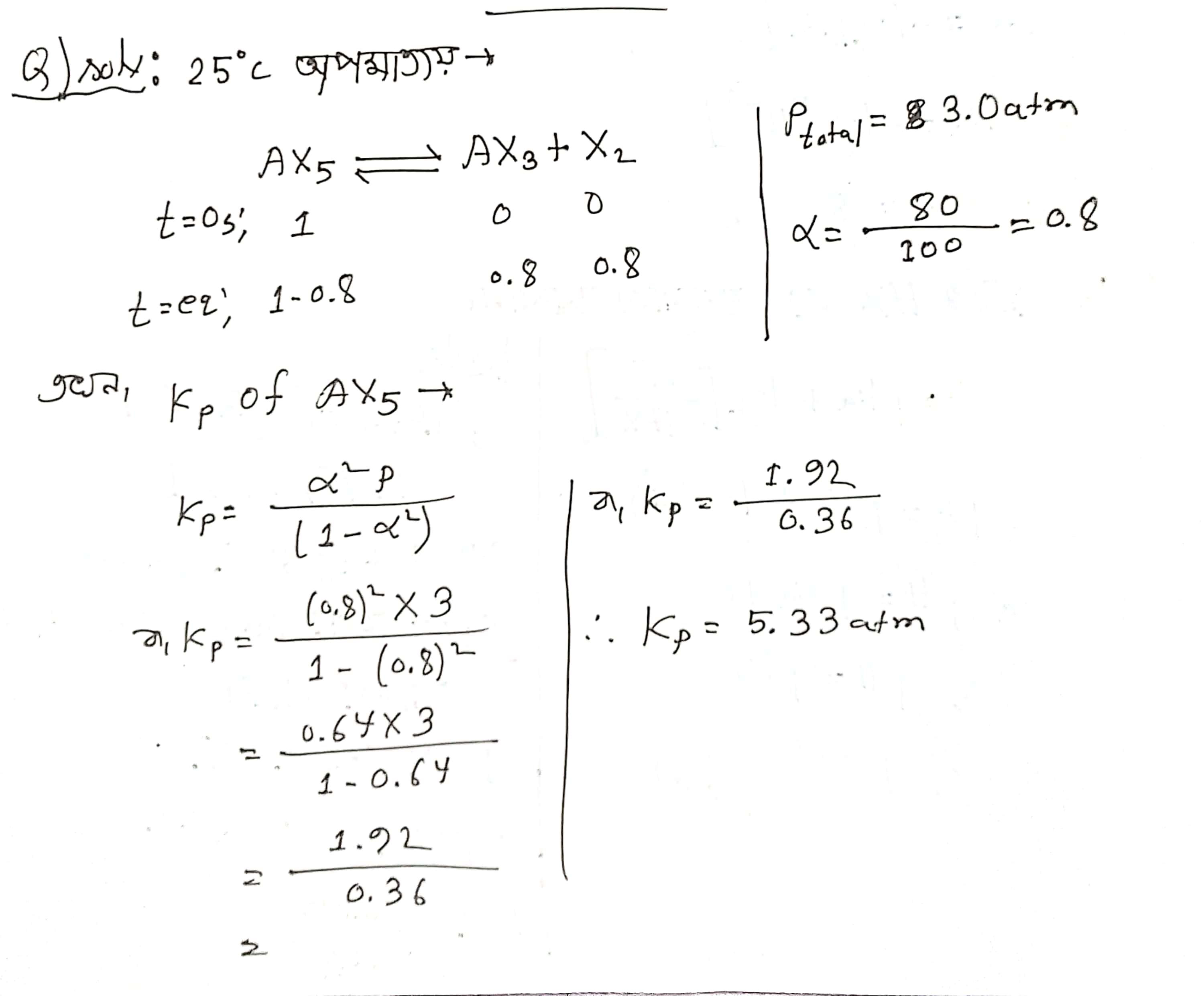 25°C তাপমাত্রায় ও 3.0 atm চাপে AX5 80% বিয়োজিত হয়ে AX3 এবং X₂ উৎপন্ন করলে বিক্রিয়াটির K, কত?