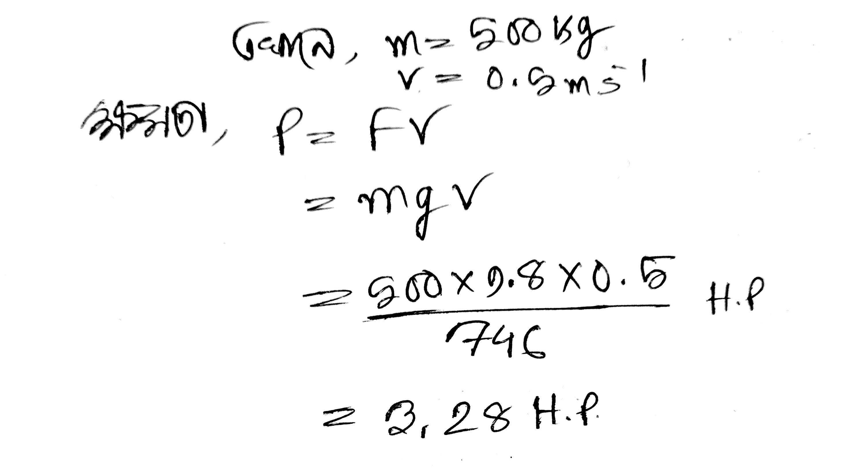 500 kg ভরের একটি লিফট 0.5 ms-1 ধ্রুব বেগে উপরের দিকে উঠছে। ব্যবহৃত মোটরের ন্যূনতম অশ্ব ক্ষমতা কত?
