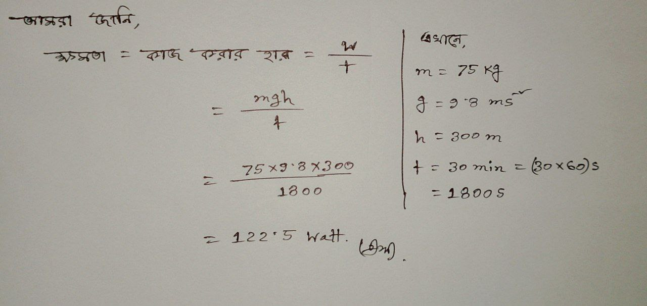 75kgভরের এক ব্যক্তি 30 মিনিটে 300 মিটার উচুতে উঠে। তার কাজ করার হার কত?