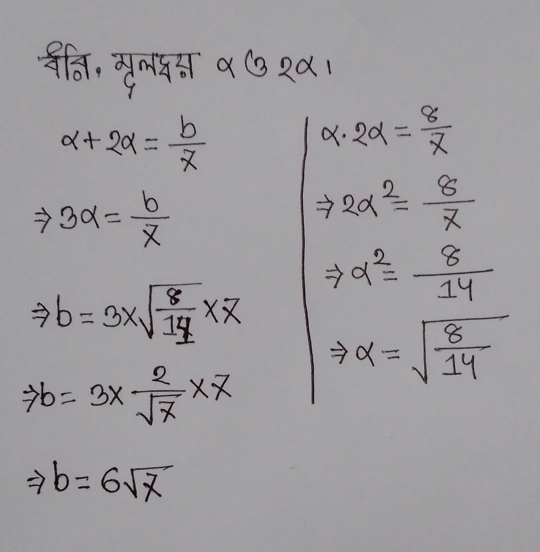7x2-bx+8=0 সমীকরণের একটি মূল অপরটির দ্বিগুন হলে b এর মান কোনটি?