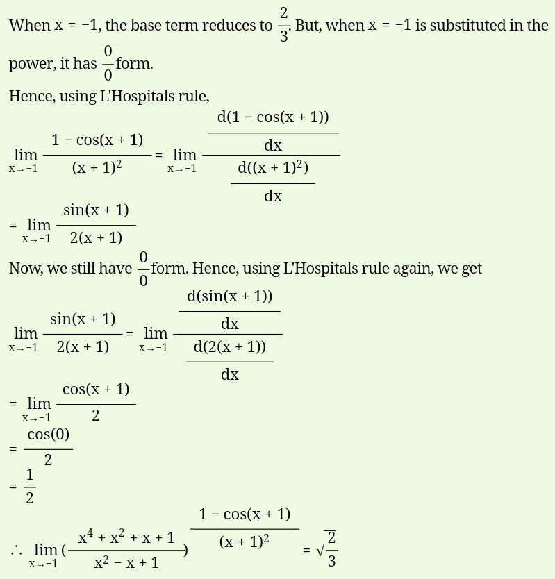 limx→−1(x4+x2+x+1x2−x+1)1−cos(x+1)(x+1)2\displaystyle \lim _{x \rightarrow -1}\left(\dfrac{x^{4}+x^{2}+x+1}{x^{2}-x+1}\right)^{\dfrac{1-\cos (x+1)}{(x+1)^{2}}} x→−1lim(x2−x+1x4+x2+x+1)(x+1)21−cos(x+1) is equal to: