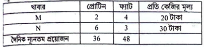 দৃশ্যকল্প-১: M ও N দুই প্রকার খাবারে প্রতি কেজিতে নিচের ছক অনুযায়ী প্রোটিন ও ফ্যাট আছে।
