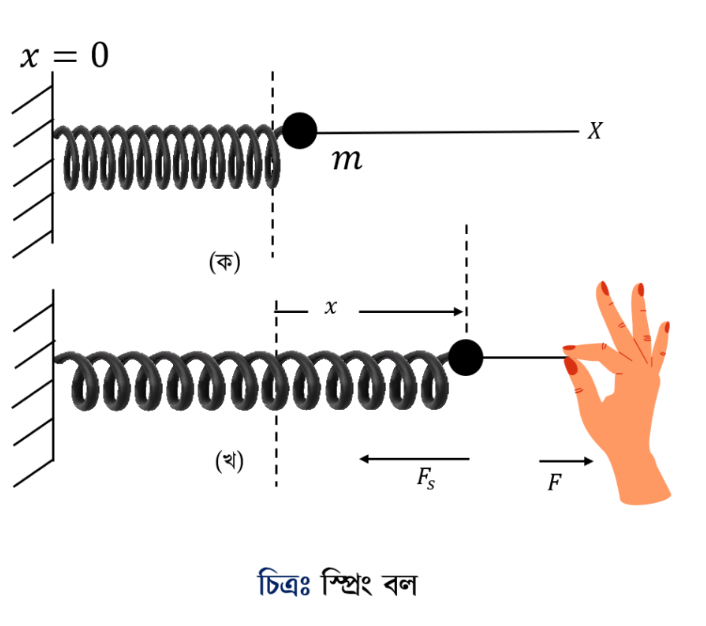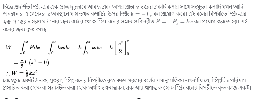 k স্প্রিং ধ্রুবকবিশিষ্ট কোনো স্প্রিং-এর মুক্ত প্রান্তের x পরিমাণ সরণ ঘটলে সঞ্চিত বিভব শক্তি –