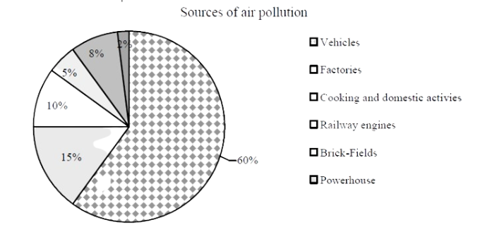 The chart shows the sources of air pollution in a city. Vehicles, factories, cooking and domestic activities, railway engines, brick-fields and powerhouses are the sources of air pollution according to the chart. of the total air pollution is caused by vehicles, so it is the main source of pollution in that particular city. Factories are the second largest source of pollution; it is responsible for of the pollution. Then comes the cooking and domestic activities which cause of the pollution. Railway engines and brick fields are responsible for and pollution respectively. Powerhouses cause air pollution which is the least according to the chart. The given chart provides us with an idea about the major sources of air pollution in a city. We can see that the fumes emitted by motor vehicles act as the main source of air pollution.