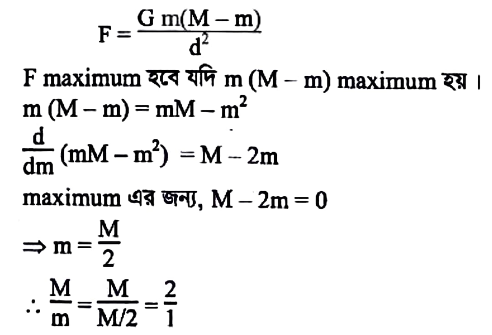 M ভরের বস্তুকে কেটে m ও (M-m) ভরের বস্তুতে রূপান্তরিত করা হল। M/m এর অনুপাত কি হলে এদের মধ্যে মহাকর্ষ বল সর্বোচ্চ হবে।