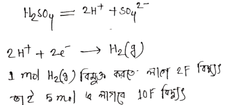 NTP তে H2SO4 এর জলীয় দ্রবণে কী পরিমাণ তড়িৎ চালনা করলে ক্যাথোডে 5 মোল হাইড্রোজেন গ্যাস বিমুক্ত হয়?