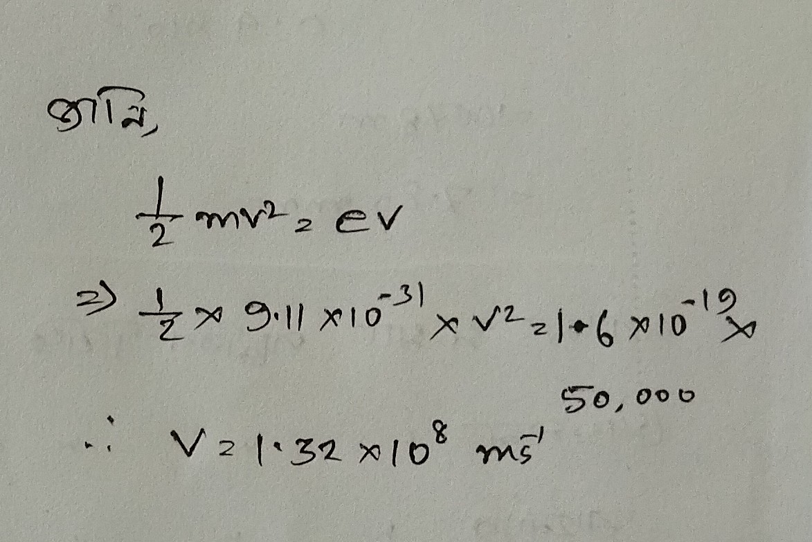 P ও Q দুটি এক্স রশ্মি মেশিনে অ্যানোড ও ক্যাথোড এর মধ্যে বিভব পার্থক্য যথাক্রমে 50 kV ও 30 kV। P মেশিনে ক্যাথোড হতে নির্গত ইলেকট্রনের বেগ কত?