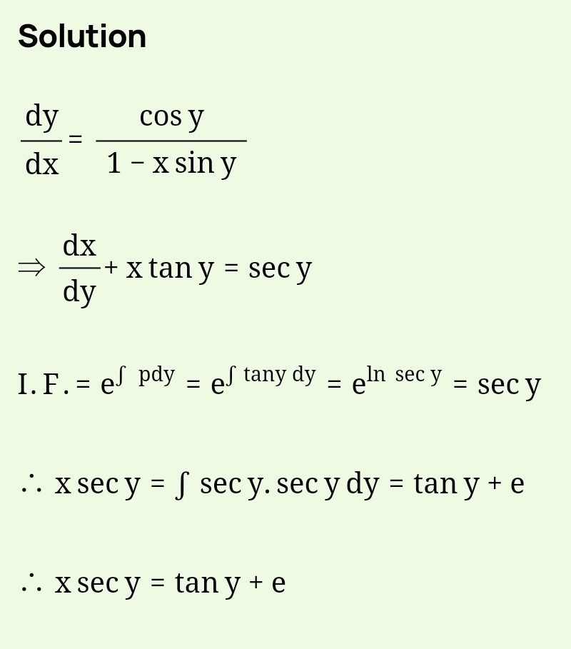 The solution of cosy+(xsiny−1)dydx=0\cos y +(x \sin y-1)\dfrac{dy}{dx}=0cosy+(xsiny−1)dxdy=0 is