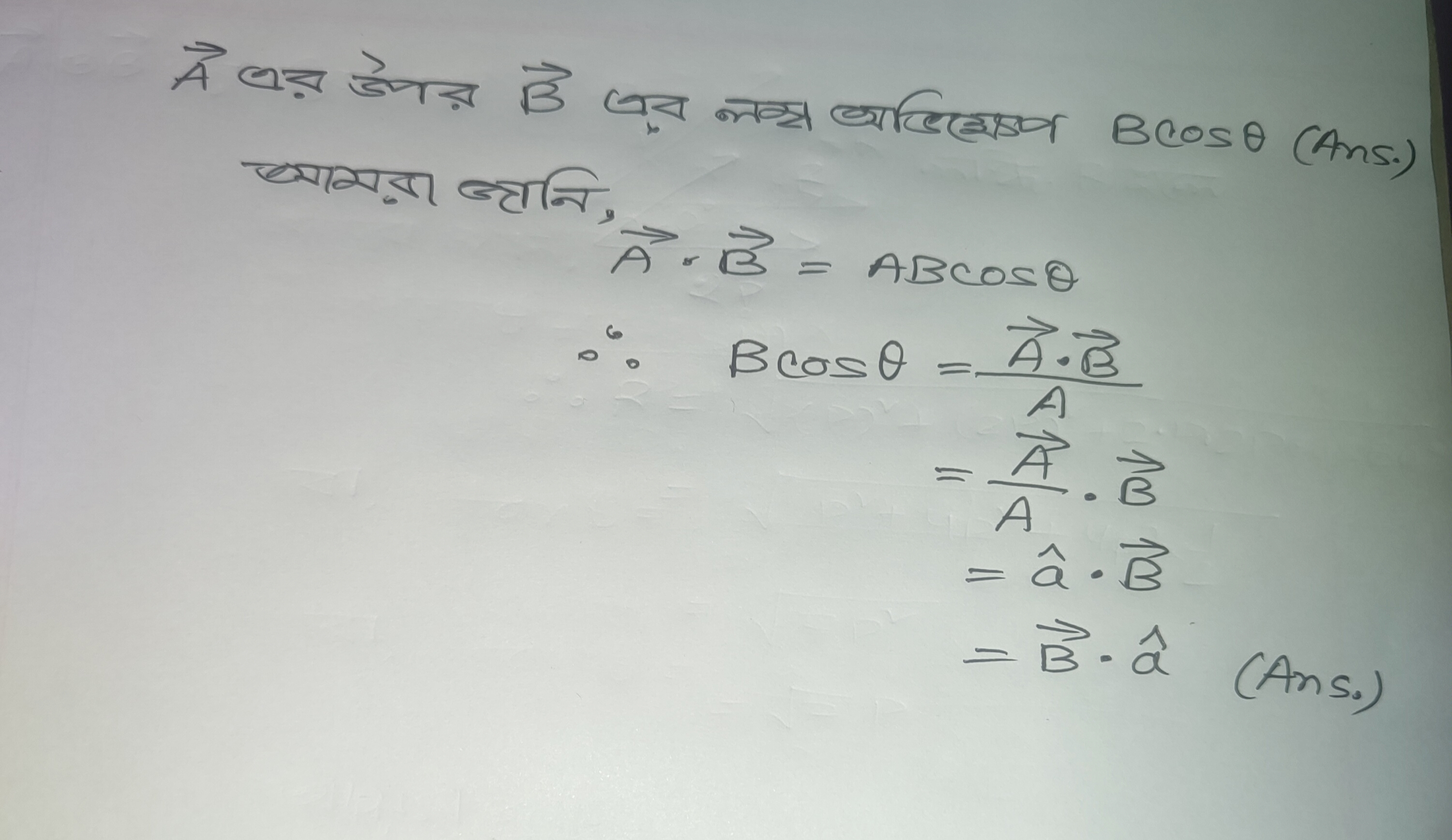 ও এর মধ্যবর্তী কোণ θ এবং এর দিকে একটি একক ভেক্টর হলে এর উপর এর লম্ব অভিক্ষেপ হলো-