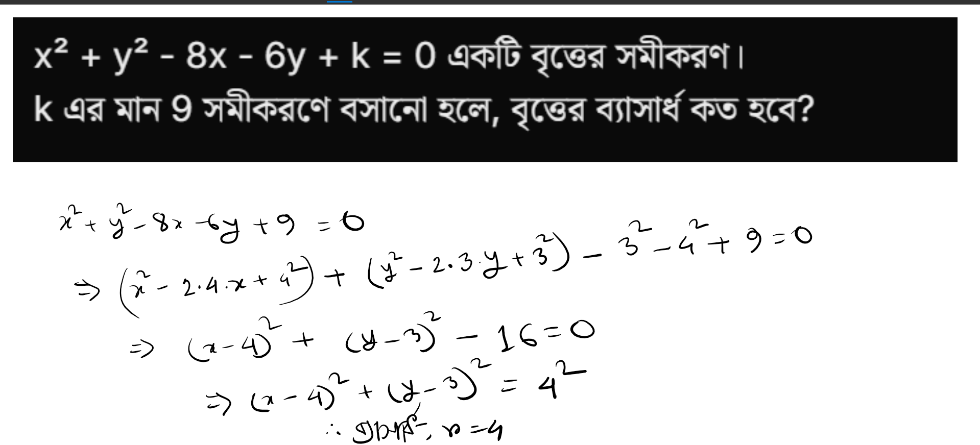 k এর মান 9 সমীকরণে বসানো হলে, বৃত্তের ব্যাসার্ধ কত হবে?