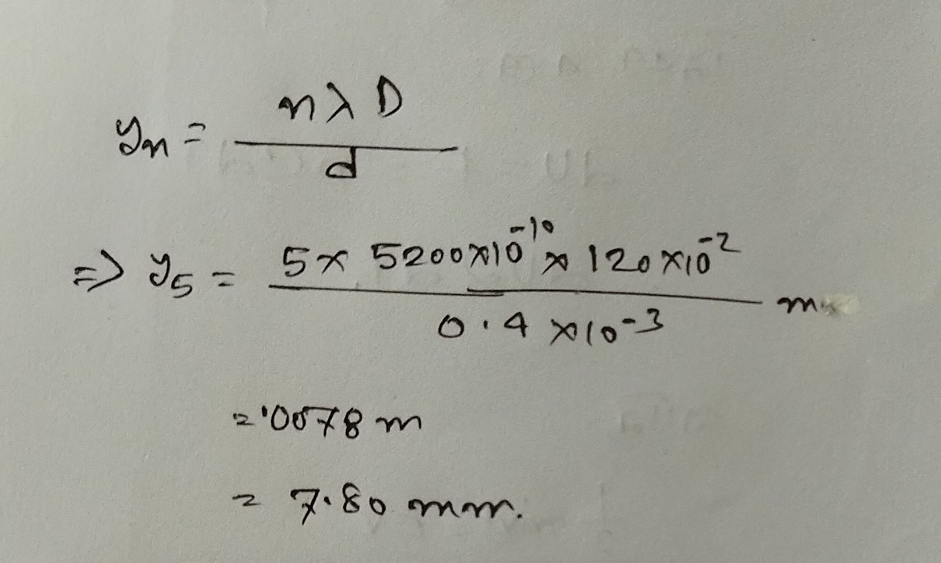ইয়ং এর দ্বি-চিড় পরীক্ষায় চিড়দ্বয়ের মধ্যবর্তী দূরত্ব 0.4mm এবং চিড় হতে পর্দার দূরত্ব 1.2 m। ব্যবহৃত আলোর তরঙ্গদৈর্ঘ্য 3800 । কেন্দ্রীয় উজ্জ্বল বিন্দুর উভয় পাশে 9.12 mm পর্যন্ত আলোর বিস্তৃতি পাওয়া যায়। [একটি চিড়ের প্রন্থ 0.1 mm]