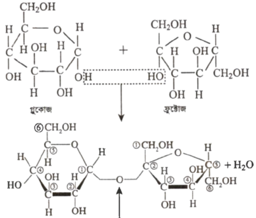 উদ্দীপকের ক এবং খ যথাক্রমে গ্লুকোজ ও ফ্রুক্টোজ। গ্লুকোজ ও ফ্রুক্টোজ একত্রিত হয়ে সুক্রোজ গঠন করে। এতে এক অণু পানি সৃষ্টি হয়ে বেরিয়ে যায়। চিনি হলো একটি সাধারণ সুকরোজ। ইক্ষু এবং বীট থেকে চিনি পাওয়া যায়। গুকোজ এবং ফ্রুক্টোজ উভয়ই রিডিউসিং শ্যুগার, কিন্তু সুকরোজ রিডিউসিং শ্যুগার নয়। কারণ সুকরোজ তৈরির সময় দুটি মনোস্যাকারাইডের মুক্ত অ্যালডিহাইড ও কিটোন গ্রুপের অস্তিত্ব নষ্ট হয়ে যাওয়ায় এর বিজারণ ক্ষমতা লুপ্ত হয়। সেজন্য এটিকে বিজারণ ক্ষমতাহীন চিনি বলে। সুকরোজ তৈরির সময় দুটি মনোস্যাকারাইড তথ্য α-D-গ্লুকোজের ১নং কার্বনের –OH এবং B-D-ফ্রুক্টোজের ২নং কার্বনের OH থেকে এক অণু পানি অপসারিত হয়। ফলে কার্বন দুটির মধ্যে একটি গ্লাইকোসাইডিক বন্ধনী বা অক্সিজেন ব্রিজ (0) গঠিত হয়ে সুকরোজ সৃষ্টি হয়।