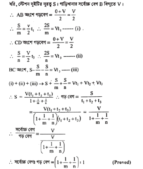 একখানা রেলগাড়ি এক স্টেশন হতে ছেড়ে অন্য স্টেশনে গিত্রে থামে। গাড়িথানা তার গতিপথের প্রথম অংশ সমত্রণে, শেষ অংশ সমমন্দনে এবং অবশিষ্টাংশ সমবেগে চলে। প্রমাণ কর যে, সর্বোচ্চ বেগ ও গড়বেগের অনুপাত .