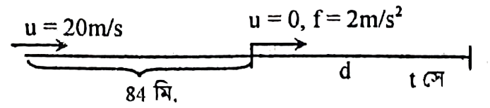 একজন সাইকেল আরোহী একটি ইঞ্জিনের 84 m পশ্চাৎ হতে 20m/s সমবেগে তার দিকে যাত্রা শুরু করলো। এসময় ইঞ্জিনটি 2 m/s2 সমত্বরনে সম্মুখে যাত্রা করলে তারা কত সেকেন্ডে মিলিত হবে?